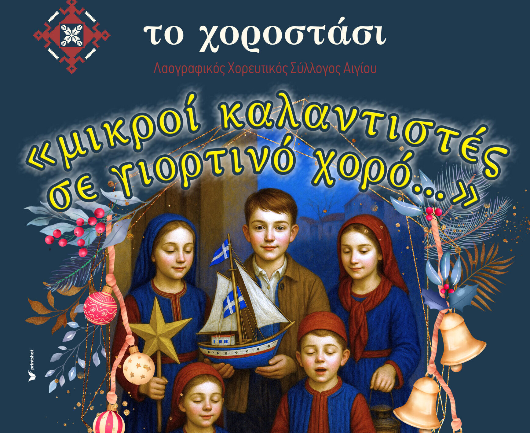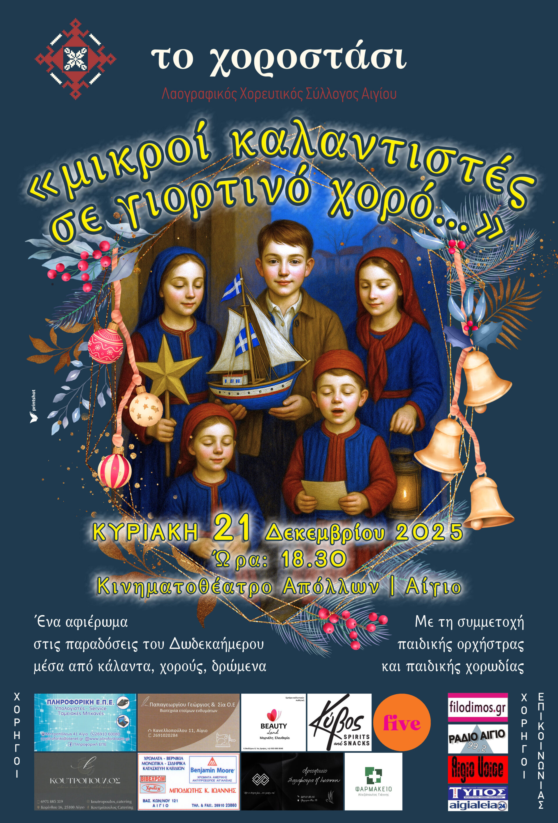 Με κάλαντα και χορούς θα υποδεχτούν τις γιορτές οι μικροί χορευτές-χορεύτριες του Χοροστασίου. Η θεματική παράσταση «μικροί καλαντίστες σε γιορτινό χορό» θα γίνει την Κυριακή 21 Δεκέμβρη, στις 6.30 το απόγευμα, στο κινηματοθέατρο Απόλλων στο Αίγιο.