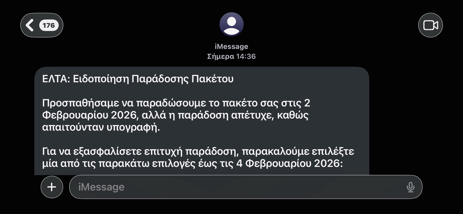 Νέα παραπλανητικά μηνύματα για υποτιθέμενα πακέτα από τα ΕΛΤΑ που δεν έφτασαν στα χέρια του παραλήπτη λαμβάνουν τις τελευταίες ημέρες πολλοί πολίτες και θα πρέπει να επιδείξουν ιδιαίτερη προσοχή ώστε να μην ακολουθήσουν τις οδηγίες που τους δίνονται.