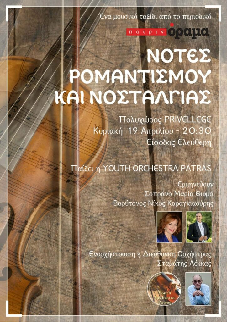 Το περιοδικό “Πατρινόραμα” Hellenic παρουσιάζει τη μουσική εκδήλωση «Νότες Ρομαντισμού & Νοσταλγίας», που θα πραγματοποιηθεί την Κυριακή 19 Απριλίου 2026, στις 20:30, στον Πολυχώρο Privellege, Κονταξή & Πάροδος Αθηνών, στην Πάτρα.