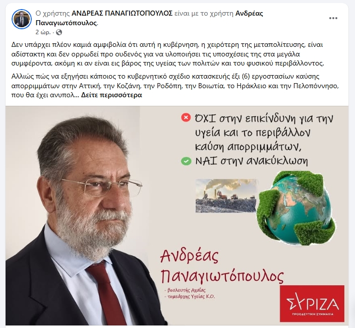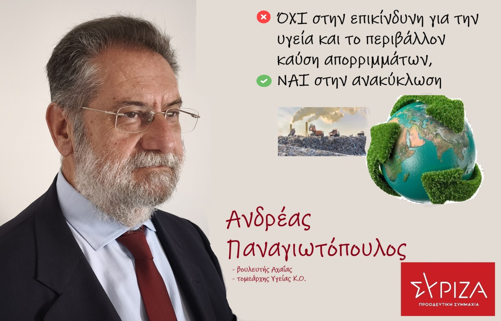 Σε ανάρτησή του, για το θέμα διαχείρισης απορριμμάτων, ο βουλευτής Αχαϊας του ΣΥΡΙΖΑ, Ανδρέας Παναγιωτόπουλος, αναφέρει: