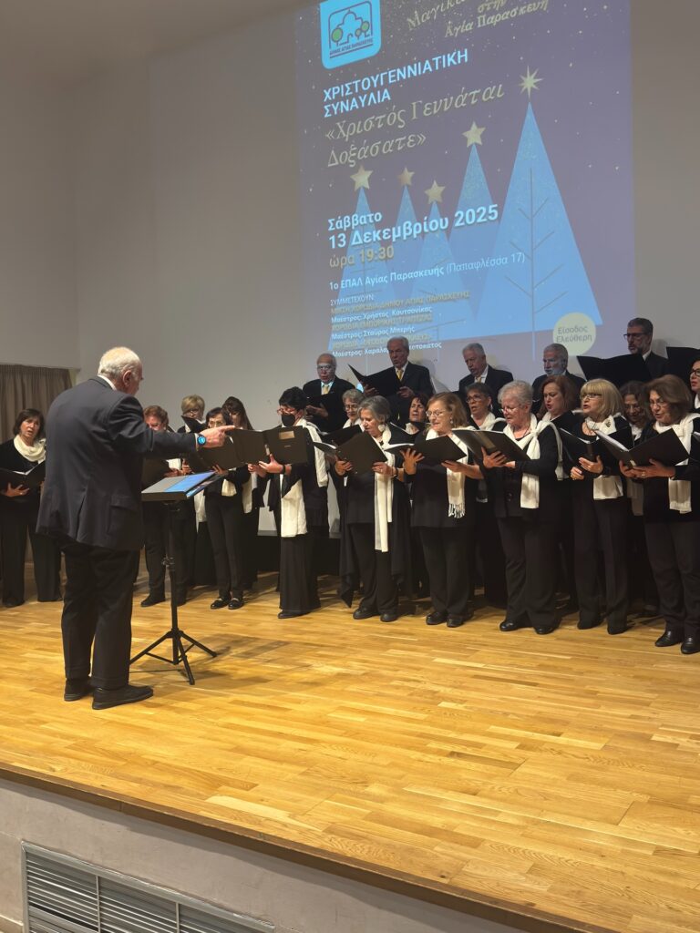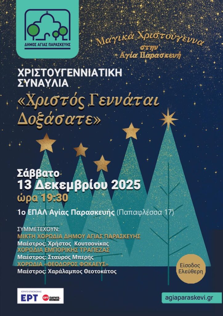 Μία καταπληκτική Χριστουγεννιάτικη μουσική εκδήλωση πραγματοποιήθηκε το Σάββατο 13 Δεκεμβρίου 2025 και ώρα 7:30 στο συνεδριακό μουσικό κέντρο του 1ου ΕΠΑΛ Αγίας Παρασκευής Αθηνών. Στην συναυλία συμμετείχαν η οικοδέσποινα Μικτή Χορωδία του Δήμου Αγίας Παρασκευής, υπό την διεύθυνση του μαέστρου κ. Χρήστου Κουτσονίκα, η ιστορική Χορωδία της Εμπορικής Τράπεζας, υπό την διεύθυνση του μαέστρου της κ. Σταύρου Μπερή και η Βυζαντινή – ΠαραδοσιακήΧορωδία της Αποστολικής πόλεως των Πατρών,«Θεόδωρος Φωκαεύς», υπό την διεύθυνση του Χοράρχητης, Μουσικολογιωτάτου Πρωτοψάλτου και Καθηγητή Βυζαντινής μουσικής. κ.Χαραλάμπους Θεοτοκάτου. Η συναυλία έγινε υπό την αιγίδα του Δήμου της Αγίας Παρασκευής και της Στέγης Ελληνικών Χορωδιών, της οποίας μέλη αποτελούν και οι τρεις συμμετέχουσες χορωδίες, με χορηγό επικοινωνίας την ΕΡΤ.