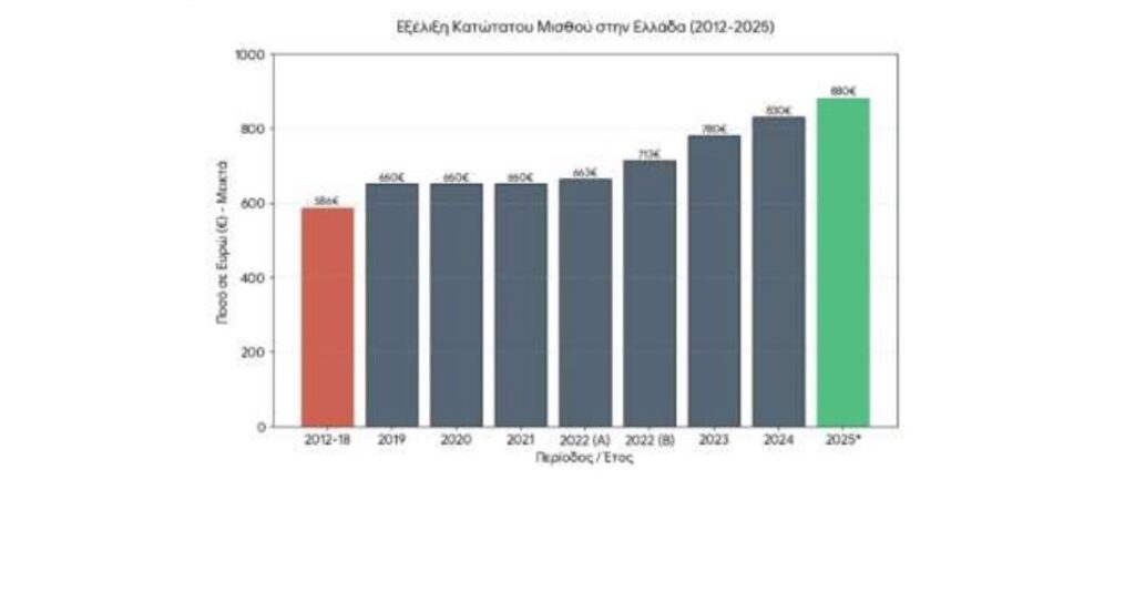 (Ακολουθεί γράφημα με τίτλο «Εξέλιξη Κατώτατου Μισθού στην Ελλάδα (2012-2025)»)