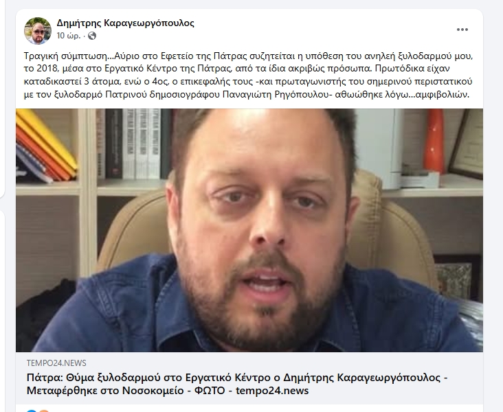 Τραγική σύμπτωση…Αύριο στο Εφετείο της Πάτρας συζητείται η υπόθεση του ανηλεή ξυλοδαρμού μου, το 2018, μέσα στο Εργατικό Κέντρο της Πάτρας, από τα ίδια ακριβώς πρόσωπα. Πρωτόδικα είχαν καταδικαστεί 3 άτομα, ενώ ο 4ος, ο επικεφαλής τους -και πρωταγωνιστής του σημερινού περιστατικού με τον ξυλοδαρμό Πατρινού δημοσιογράφου Παναγιώτη Ρηγόπουλου- αθωώθηκε λόγω…αμφιβολιών.
