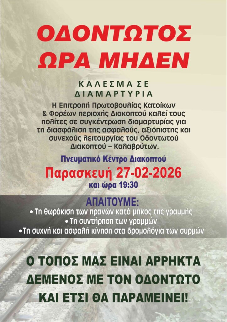 Η Επιτροπή Πρωτοβουλίας Κατοίκων & Φορέων περιοχής Διακοπτού μετά τα τελευταία απανωτά συμβάντα στη λειτουργία των συρμών του Οδοντωτού Διακοπτού – Καλαβρύτων καλεί όλους τους συμπολίτες και όχι μόνο, σε συγκέντρωση διαμαρτυρίας στο Πνευματικό Κέντρο Διακοπτού την Παρασκευή 27-02-2026 και ώρα 19:30.