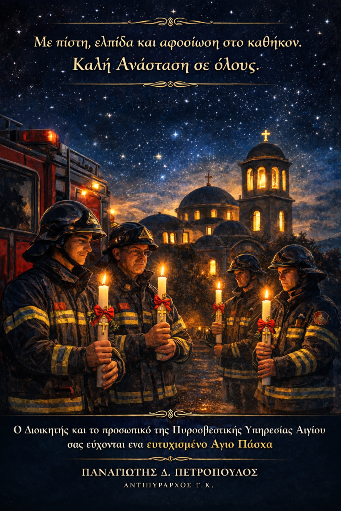 Με μία συγκινητική κάρτα οι Πυροσβέστες της πόλης και ο Διοικητής τους Αντιπύραρχος Παναγιώτης Πετρόπουλος, μας εύχονται Καλή Ανάσταση!