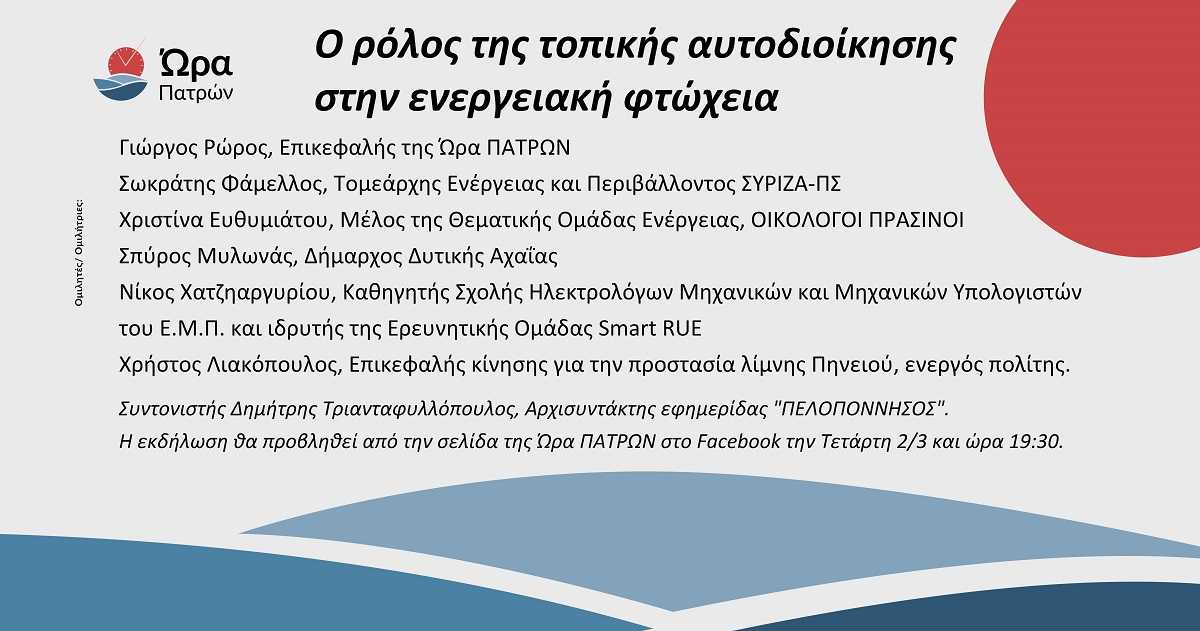Την Τετάρτη 2/3 και ώρα 19:30 η Ώρα ΠΑΤΡΩΝ διοργανώνει διαδικτυακή εκδήλωση με θέμα: «Ο ρόλος της τοπικής αυτοδιοίκησης στην ενεργειακή φτώχεια». Η Ώρα Πατρών ανοίγει τη συζήτηση στο Δήμο Πατρέων για την ενεργειακή Δημοκρατία, με ενεργειακές κοινότητες και άλλες μορφές για όφελος των πολλών,ώστε να πετύχουμε μείωση του κόστους ενέργειας για τους πολίτες.