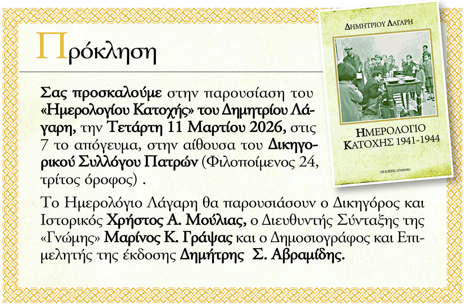 Εκδήλωση για την παρουσίαση του «Ημερολογίου Κατοχής» του Δημητρίου Λάγαρη που κυκλοφορεί από τις Εκδόσεις «ΓΝΩΜΗ», την Τετάρτη 11 Μαρτίου 2026 και ώρα 7 το απόγευμα, στην αίθουσα του Δικηγορικού Συλλόγου Πατρών (Φιλοποίμενος 4, τρίτος όροφος).