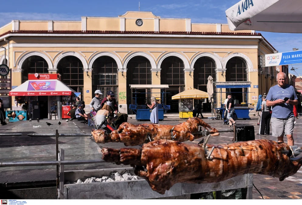 Από πολύ νωρίς το πρωί της Κυριακής του Πάσχα, στήθηκαν οι σούβλες στο Μοναστηράκι, με αρνιά και κοκορέτσια να ψήνονται, στο πλαίσιο του εθίμου που διατηρούν οι καταστηματάρχες της περιοχής.