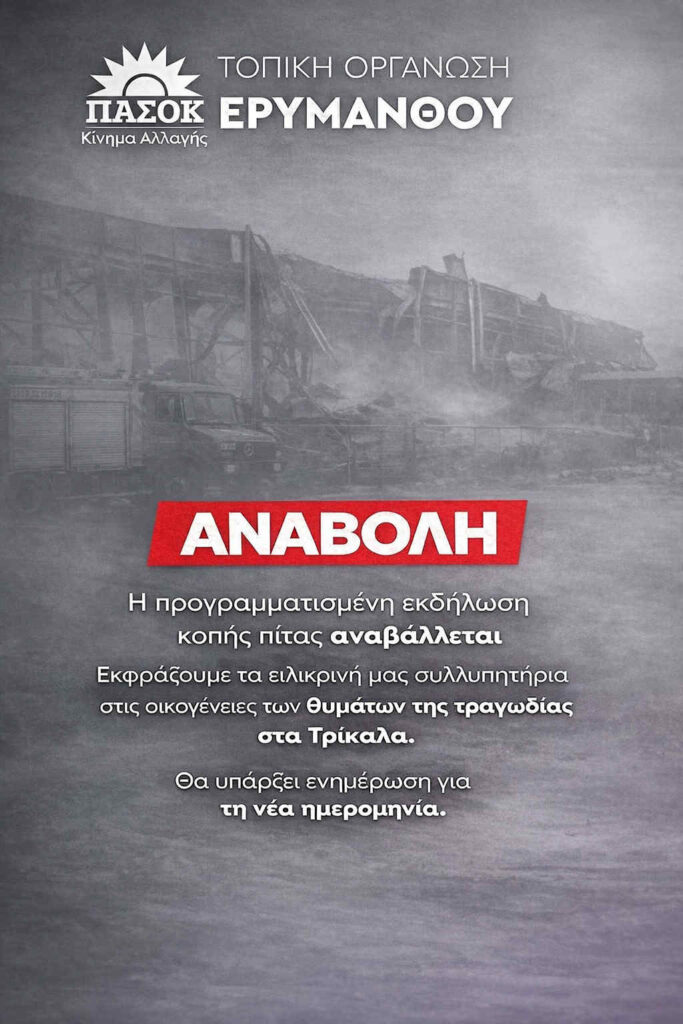 Η αποψινή, προγραμματισμένη εκδήλωση κοπής πίτας της Τ.Ο. ΠΑΣΟΚ – Κινήματος Αλλαγής Ερυμάνθου, ΑΝΑΒΑΛΛΕΤΑΙ, σε συνέχεια της απόφασης του Κινήματος, ως ένδειξη σεβασμού μετά την τραγωδία στα Τρίκαλα (εργοστάσιο Βιολάντα).
