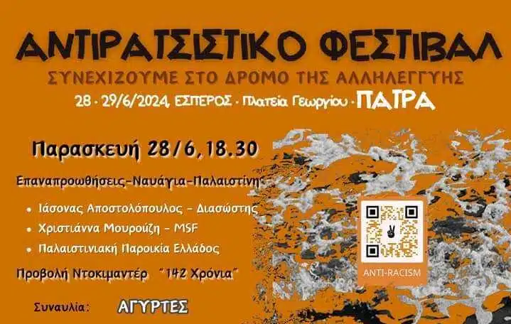 * ΑΝΤΙΡΑΤΣΙΣΤΙΚΟ ΦΕΣΤΙΒΑΛ ΠΑΤΡΑΣ * – 28-29 ΙΟΥΝΙΟΥ, ΕΣΠΕΡΟΣ- ΠΛΑΤΕΙΑ ΓΕΩΡΓΙΟΥ- ΠΑΤΡΑ