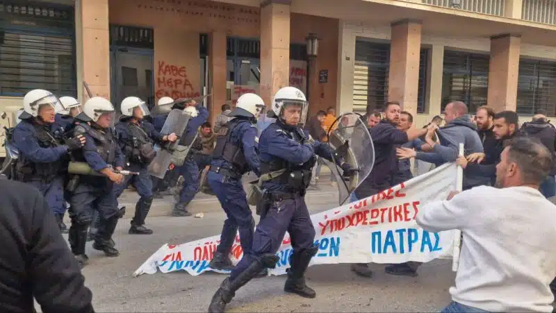 Επεισόδια στην συγκέντρωση των οικοδόμων μπροστα από το ΙΚΑ της Πάτρας. Ενώ μιλούσε ο Πρόεδρος των Οικοδόμων Δημήτρης Αγγελόπουλος και η οδός Κορίνθου τα ΜΑΤ επιτέθηκαν στους οικοδόμους με δακρυγόνα και χτύπησαν τους απεργούς με γκλομπ. Νωρίτερα οι οικοδομοι είχαν “χτίσει” την πόρτα του ΙΚΑ. Οι περίοικοι φώναζαν κατά των αστυνομικών καθώς π[έταξαν χημικά μέσα στο κέντρο για ασήμαντη αφορμή και ενώ σε καφέ και Δικαστήρια υπήρχε κόσμος που αντιμετώπισε προβλήματα δύσπνοιας.