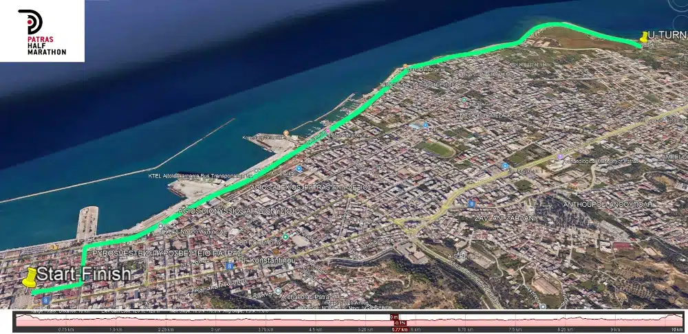 Η νέα διαδρομή των 10 χιλιομέτρων συνδυάζει ταχύτητα και μοναδική θέα, προσφέροντας μια μοναδική εμπειρία στους δρομείς που αναζητούν την ταχύτητα με φόντο το γαλάζιο του Πατραϊκού Κόλπου.