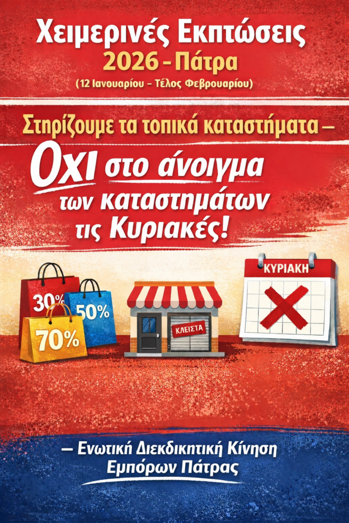 Δυστυχώς μέσα σ’ αυτή την πραγματικότητα ο Εμπορικός Σύλλογος Πατρών έχει την ατυχία να βρίσκονται στο προεδρείο άνθρωποι, ο οποίοι δεν έχουν καμία σχέση με το εμπόριο και επομένως δεν θίγονται από το καθεστώς των εκπτώσεων και των προσφορών…(φυτώριο, λογιστές, ασφαλιστές ΚΔΑΠ/ΚΕΚ).
