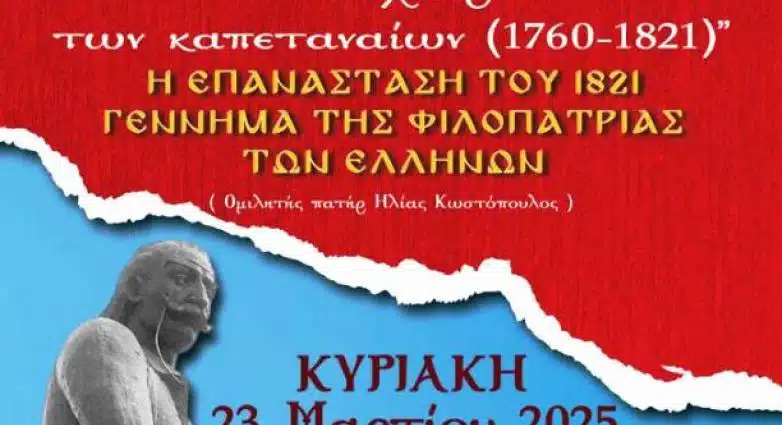 Πρόσκληση στην επετειακή εκδήλωση “Γιαννιάς: Στα χνάρια των Καπεταναίων (1760-1821)” που συνδιοργανώνουν η χορευτική ομάδα “Οι Αετοί του Μοριά” Πολιτιστικού Συλλόγου Μύλων Πατρών και η Περιφέρεια Δυτικής Ελλάδας την Κυριακή 23 Μαρτίου 2025 και ώρα 11 π.μ. στην Πλατεία Γιαννιά (Άγιος Αθανάσιος).