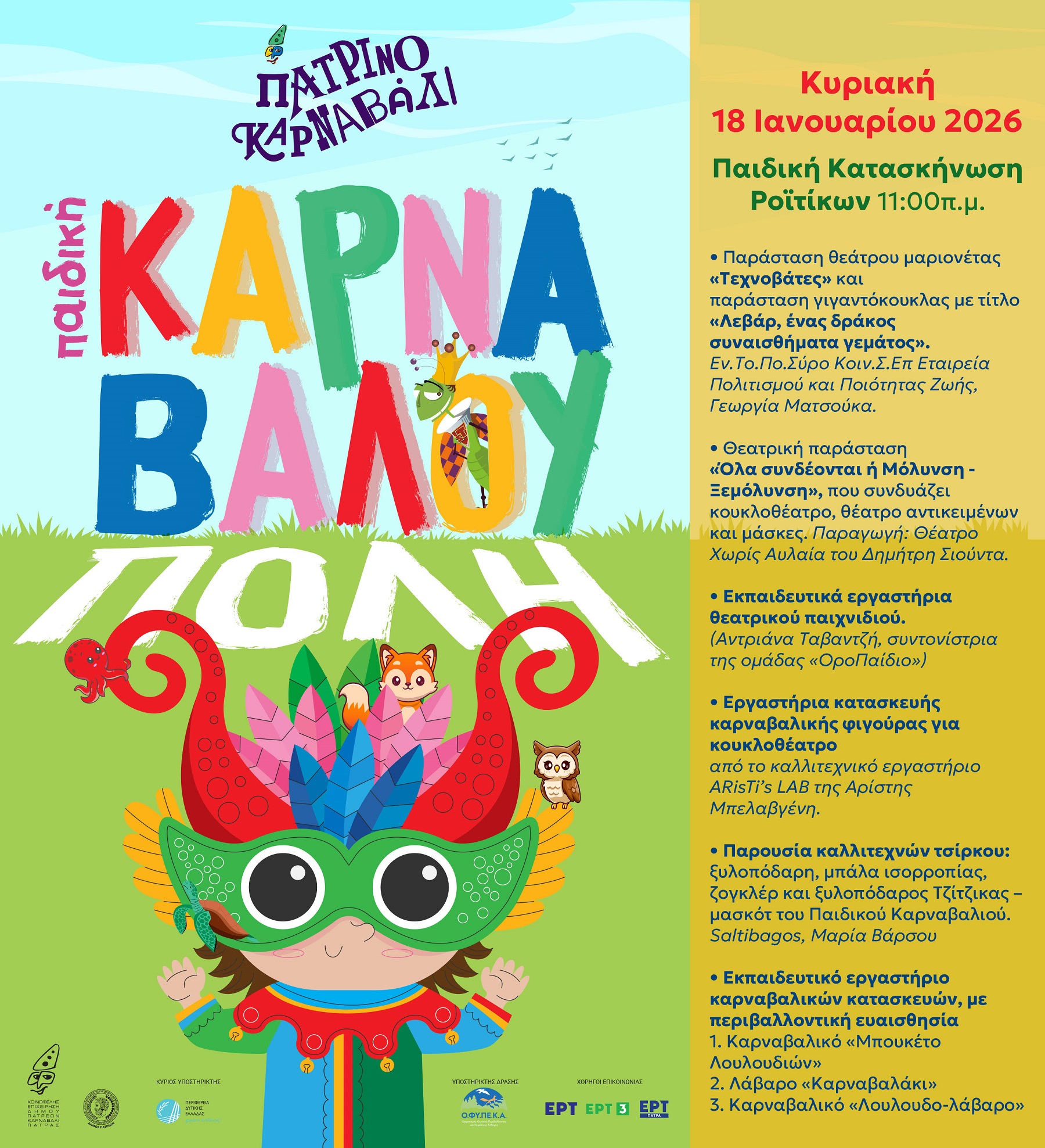 • Σάββατο 14 Φεβρουαρίου 2026 – Κεντρική Καρναβαλούπολη Πλατεία Υψηλών Αλωνίων, ώρα 11:00π.μ