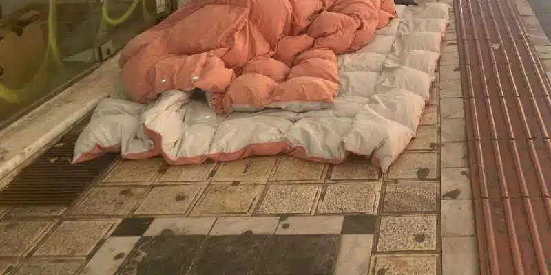 Σκεπασμένος μ’ ένα πάπλωμα κι από κάτω μια – δυο κουβέρτες ίσα – ίσα για να μην αγγίζει ,το σώμα, το πλακάκι…! Κόσμος περνά από δίπλα του, κοιτάζει, εκείνος το αντιλαμβάνεται αλλά δεν κουνιέται, δεν σηκώνεται. Άλλωστε δεν έχει πού να πάει, τι να κάνει.