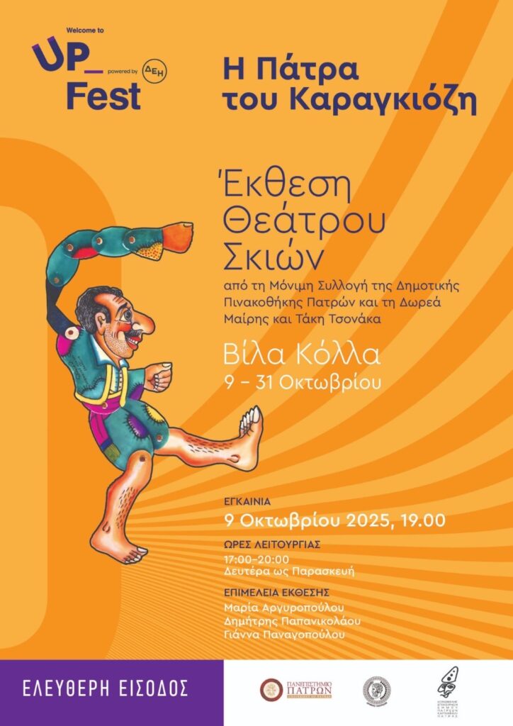 Η ΚΕΔΗΠ-Καρναβάλι Πάτρας σε συνεργασία με το Πανεπιστήμιο Πατρών, παρουσιάζει την έκθεση «Η Πάτρα του Καραγκιόζη» στην αίθουσα Βίλα Κόλλα (εγκαταστάσεις του Πανεπιστημίου στο Κουκούλι, πρώην ΤΕΙ) από τις 9 έως τις 31 Οκτωβρίου. Η δράση εντάσσεται στο φεστιβάλ “Welcome to UP 2025”, το οποίο στοχεύει στη γνωριμία των νέων φοιτητών με την πόλη, τον πολιτισμό και τις δημιουργικές της δυνάμεις.