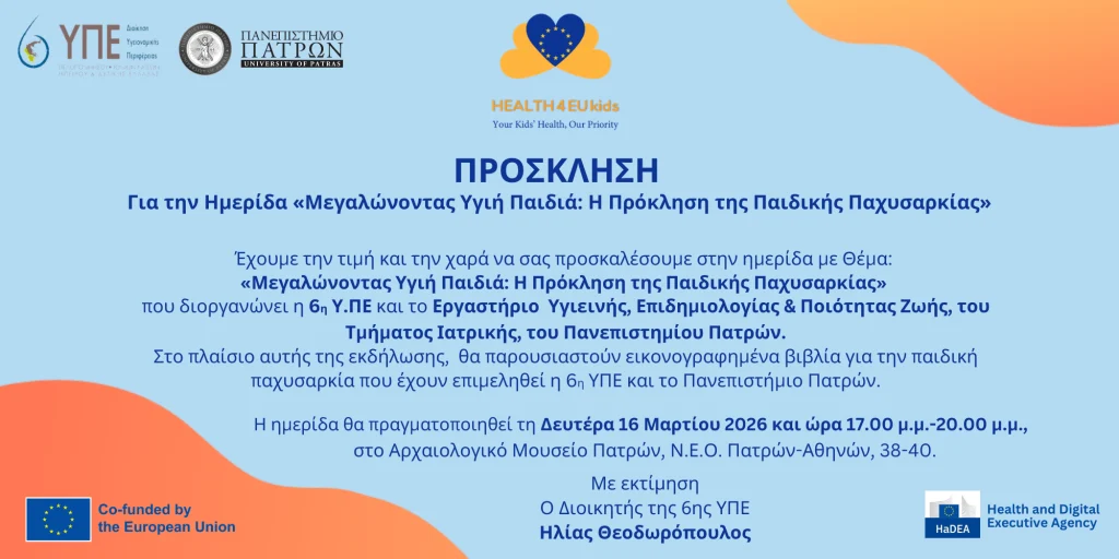 Hμερίδα για την παιδική παχυσαρκία πραγματοποιείται από την 6η ΥΠΕ και το Πανεπιστήμιο Πατρών, την Δευτέρα 16 Μαρτίου.
