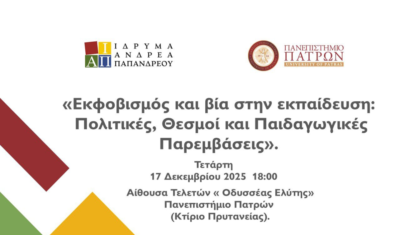 Το Ίδρυμα Ανδρέα Παπανδρέου σε συνεργασία με το Πανεπιστήμιο Πατρών, διοργανώνουν ημερίδα με θέμα: “Εκφοβισμός και βία στην Εκπαίδευση: Πολιτικές, Θεσμοί και Παιδαγωγικές Παρεμβάσεις”, την Τετάρτη 17 Δεκεμβρίου 2025 και ώρα 18:00, στην Αίθουσα Τελετών « Οδυσσέας Ελύτης» του Πανεπιστημίου Πατρών.