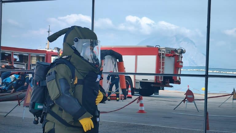 Στήθηκε ολόκληρη επιχείρηση, από την 6η ΕΜΑΚ και την ειδική ομάδα Αντιμετώπισης Χημικών-Βιολογικών-Ραδιολογικών-Πυρηνικών Απειλών και Τεχνολογικών Ατυχημάτων, με τη συνδρομή πυροσβεστών από άλλες υπηρεσίες της Πυροσβεστικής, καθώς επίσης κι εξειδικευμένου προσωπικού του Κεντρικού Λιμεναρχείου Πατρών, αλλά και προσωπικού του ΟΛΠΑ.