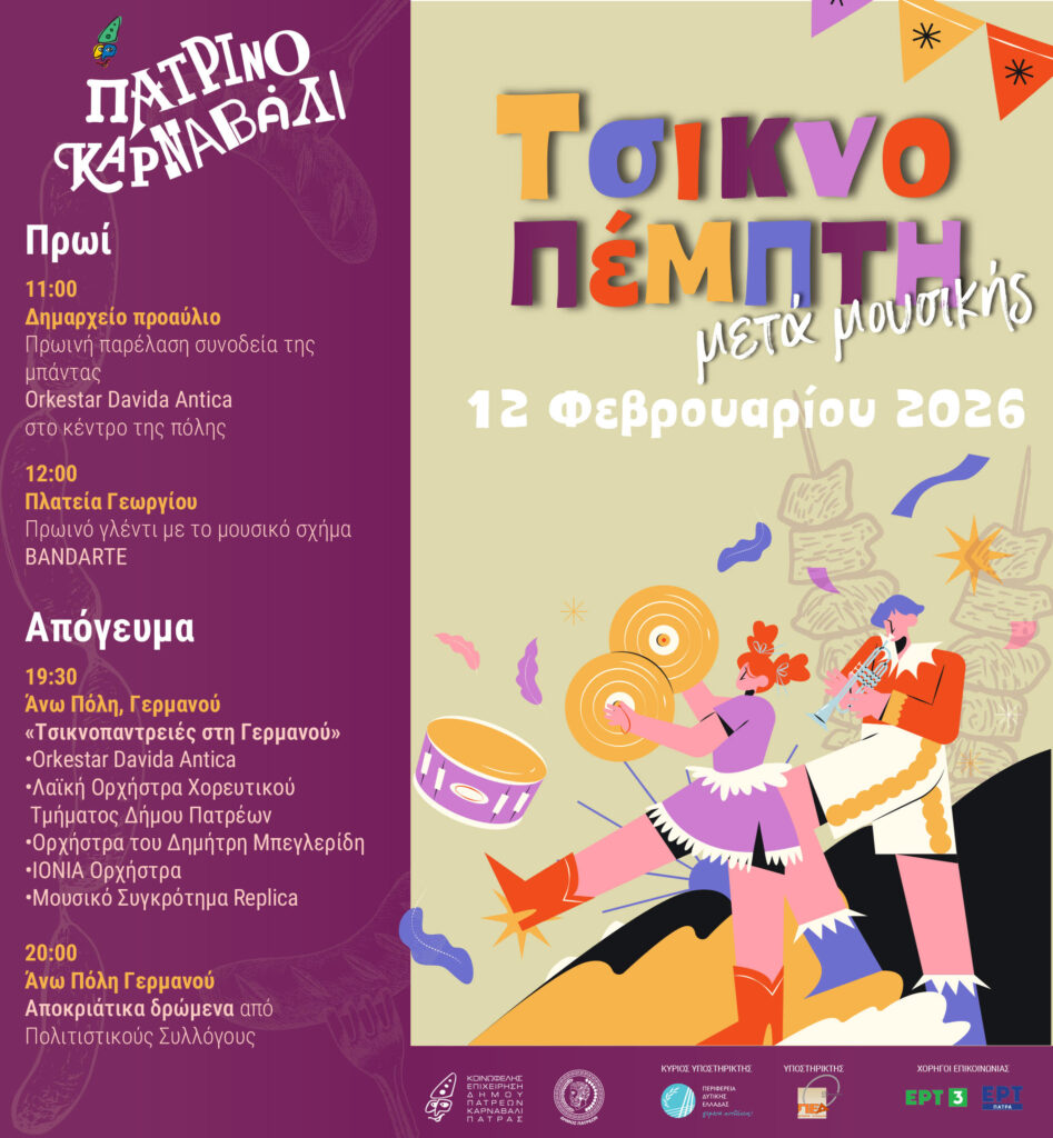 Η ΚΕΔΗΠ-Καρναβάλι Πάτρας καλεί όλους να συμμετάσχουν στο ολοήμερο γλέντι, που θα ξεσηκώσει και θα αναστατώσει με τον πιο ευχάριστο τρόπο την Πάτρα, το πρωί και το μεσημέρι την Κάτω Πόλη και το απόγευμα και το βράδυ την Άνω Πόλη.