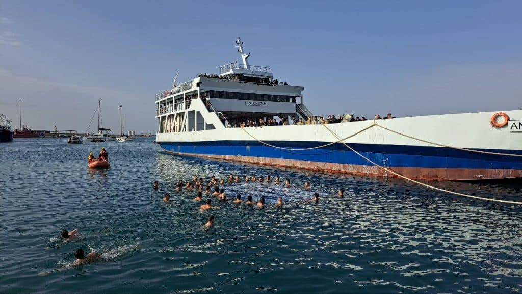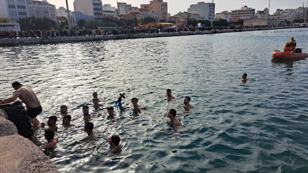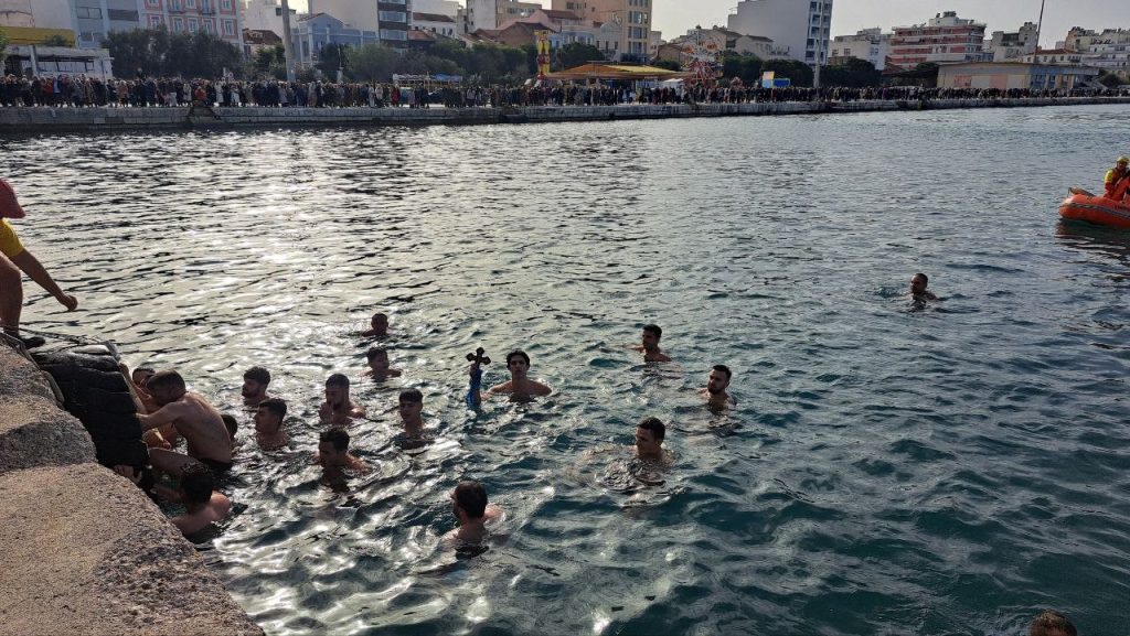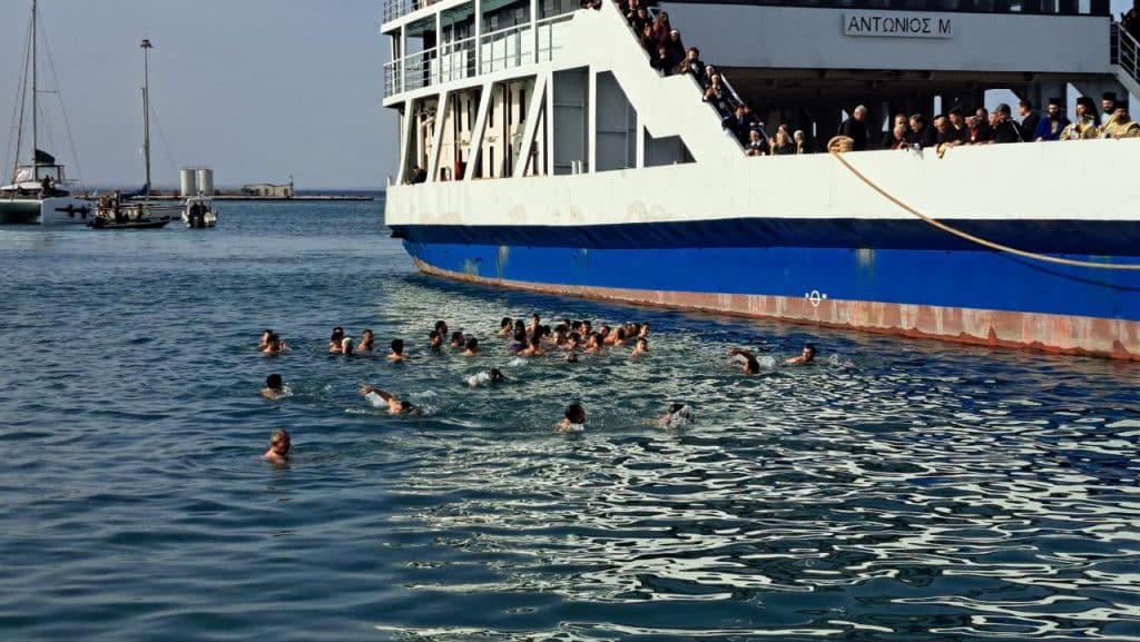 Ενας 17χρονος αθλητής της ΝΕΠ, ο Φάνης Κουρής έπιασε τον σταυρό στον μώλο της Αγίου Νικολάου. Συνολικά έπεσαν πάνω απο 40 κολυμβητές, ενώ ύψωσαν και μία τεράστια ελληνική σημαία στο φέρι μπόουτ.