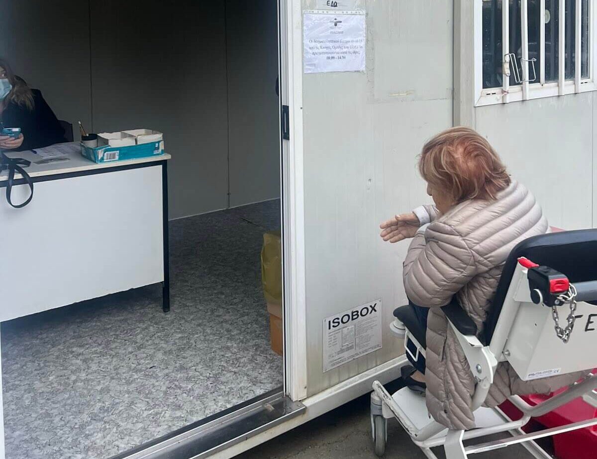 Μια ασθενής σε αναπηρικό αμαξίδιοπεριμένει υπομονετικά τη σειρά της εν μέσω βροχόπτωσης, εντελώς εκτεθειμένη στα καιρικά φαινόμενα. Η απουσία στεγάστρου αλλά και η έλλειψη κατάλληλης προσβασιμότητας, μετέτρεψαν μια απλή διαδικασία ρουτίνας σε δοκιμασία.