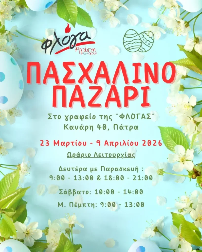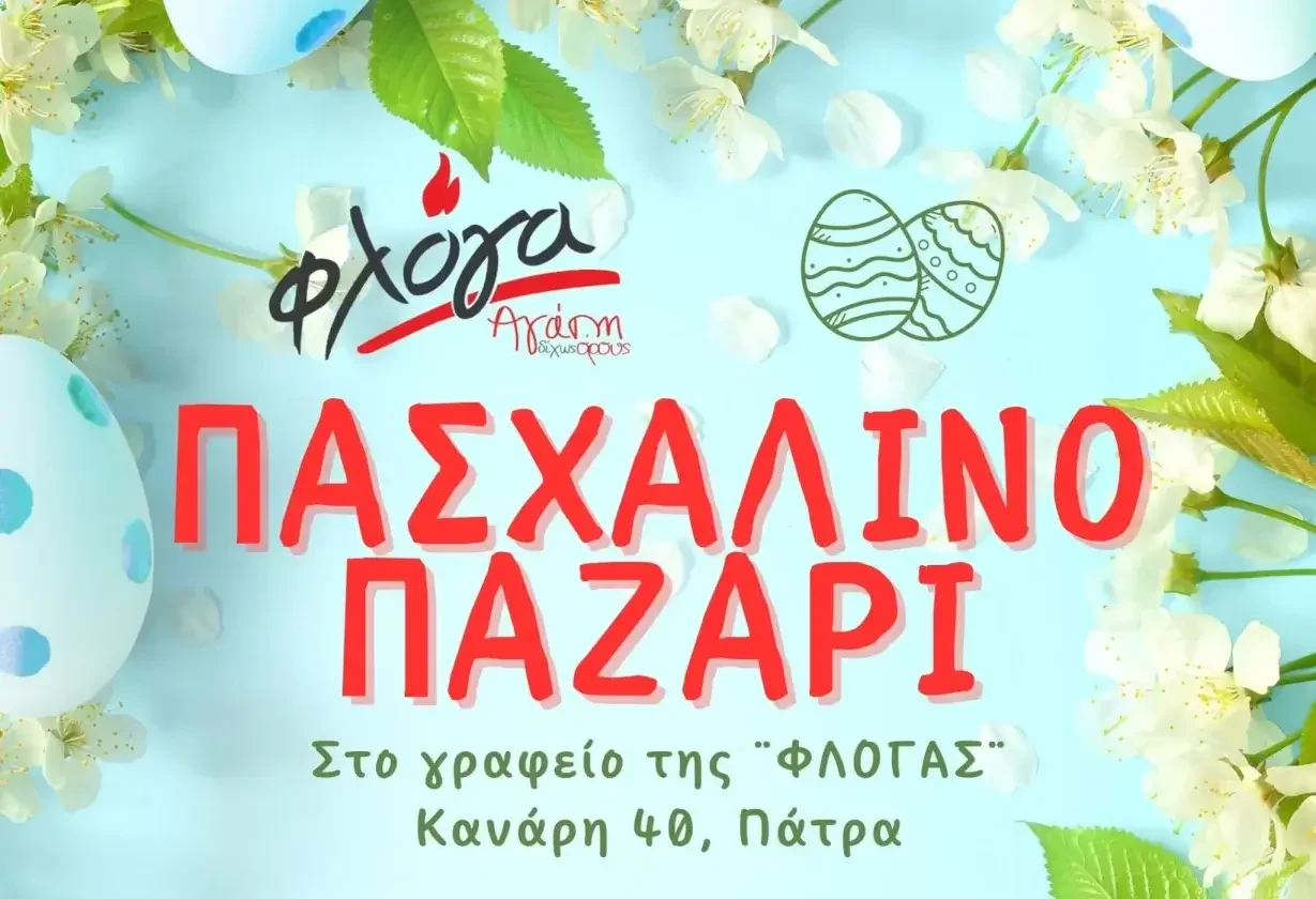 Το Πασχαλινό παζάρι θα πραγματοποιηθεί από Δευτέρα 23 Μαρτίου έως Μ. Πέμπτη 9 Απριλίου στο γραφείο της Φλόγας στην Πάτρα, Κανάρη 40, (τηλ. 2610276021).