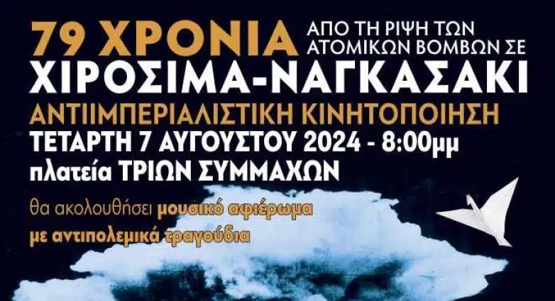 H Επιτροπή Ειρήνης Πάτρας και Δυτικής Αχαΐας καλεί σε μαζική συμμετοχή στην αντιιμπεριαλιστική συγκέντρωση την Τετάρτη 7 Αυγούστου 2024 στις 8 μ.μ. στην πλατεία Τριών Συμμάχων για να καταδικάσουμε το έγκλημα των ΗΠΑ στη Χιροσίμα και στο Ναγκασάκι και να τιμήσουμε τα θύματα της ιμπεριαλιστικής θηριωδίας.