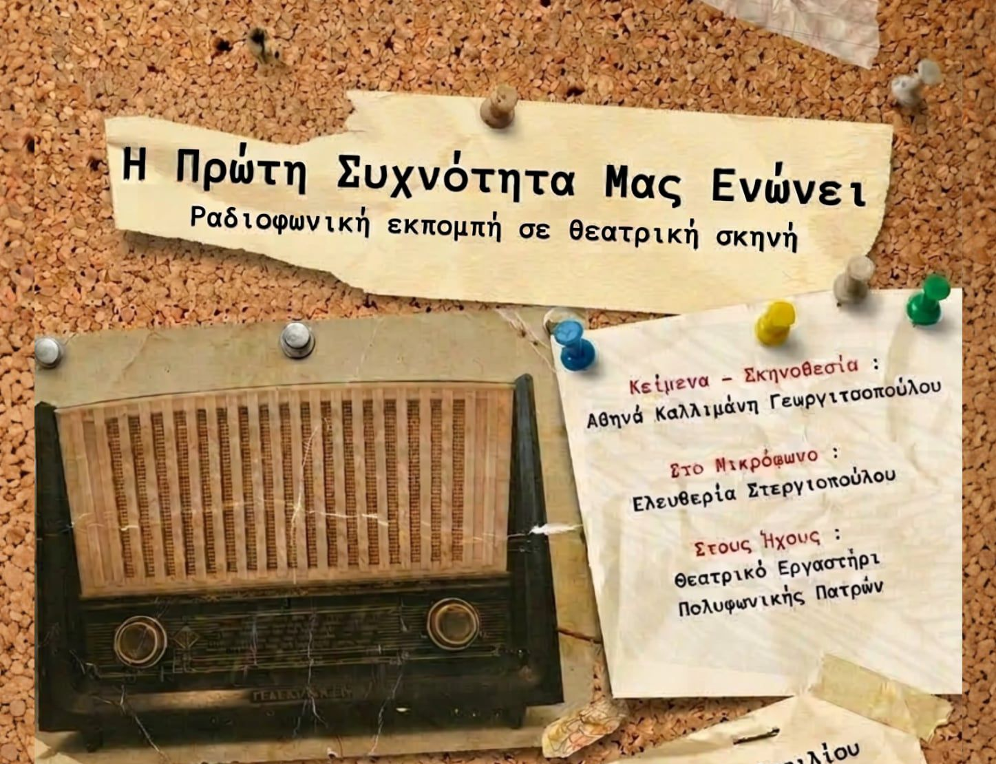 Η Περιφέρεια Δυτικής Ελλάδας διοργανώνει θεατρική παράσταση με θέμα το ραδιόφωνο, την Τετάρτη 1η Απριλίου στις 9:00μμ στο θέατρο «Γραμμές Τέχνης» (Μαιζώνος 271). Η ραδιοφωνική παραγωγός, Ελευθερία Στεργιοπούλου, σε συνεργασία με το Θεατρικό Εργαστήρι της Πολυφωνικής Πατρών παρουσιάζουν το θεατρικό έργο: «Η Πρώτη Συχνότητα μάς Ενώνει» σε σκηνοθεσία και κείμενα της Αθηνάς ΚαλλιμάνηΓεωργιτσοπούλου.