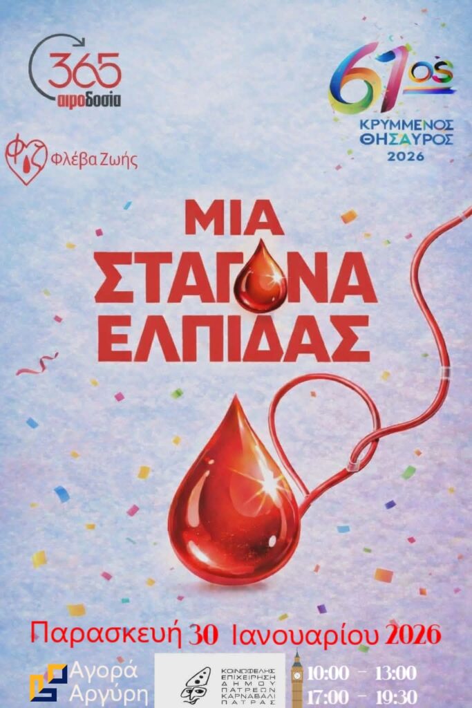 Η ΚΕΔΗΠ-Καρναβάλι Πάτρας και η οργανωτική ομάδα του 61ου Παιχνιδιού Κρυμμένου Θησαυρού (Πλήρωμα 191 – Ντορατζήδες) καλούν όλους, καρναβαλιστές, μέλη των πληρωμάτων και όλης της καρναβαλικής κοινότητας να συμμετάσχουν στην καρναβαλική αιμοδοσία με τίτλο «Μία Σταγόνα Ελπίδας» που θα πραγματοποιηθεί την Παρασκευή 30 Ιανουαρίου τις ώρες 10:00–13:00 & 17:00–19:30 στην Αγορά Αργύρη (Αγίου Ανδρέου 12).