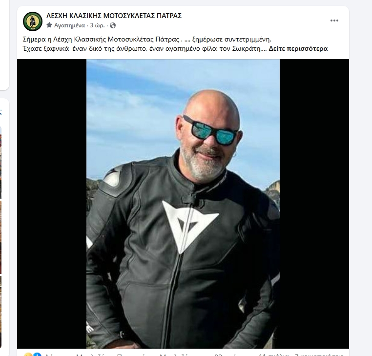Σαν κεραυνός εν αιθρία έπεσε η θλιβερή είδηση για την απώλεια του Σωκράτη Καραγιάννη, του 49χρονου που έχασε τη ζωή του σε τροχαίο στη Φωκίδα όταν «κλείστηκε» με τη μηχανή του ανάμεσα σε δύο νταλίκες. «Σήμερα η Λέσχη Κλασσικής Μοτοσυκλέτας Πάτρας ξημέρωσε συντετριμμένη», έγραψαν οι φίλοι του, αφού ο άτυχος πατρινός ήταν από τα πιο δραστήρια μέλη της Λέσχης, καθώς λάτρευε την κλασσική μηχανή και ό,τι φτιαχνόταν με αισθητή, άποψη και τέχνη. Και το μήνυμα συνεχιζόταν: «Η Λέσχη έχασε ξαφνικά έναν δικό της άνθρωπο, έναν αγαπημένο φίλο. Νέος άνθρωπος, άφησε πίσω του τα δύο του παιδιά, τον Δημήτρη και τον Αντώνη — τα είχε γραμμένα στα δύο του χέρια και κυρίως στην καρδιά του. Ήταν εργατικός, επαγγελματίας οδηγός, πάλευε καθημερινά για να ζήσει την οικογένειά του. Όσοι είχαμε την τύχη να τον γνωρίσουμε, θα θυμόμαστε πάντα το ζεστό του χαμόγελο, το χιούμορ και την ευθύτητά του. Θα λείψεις πραγματικά, Σωκράτη. Σύσσωμη η Λέσχη Κλασσικής Μοτοσυκλέτας σου εύχεται καλό παράδεισο».