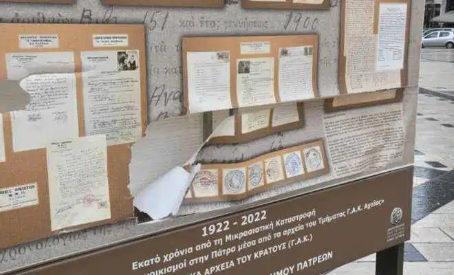 Ο δράστης ή οι δράστες κατέστρεψαν εκθέματα που είναι αναρτημένα στα ειδικά σταντ, μέσα από τα οποία με αφορμή τη συμπλήρωση 100 χρόνων από την Μικρασιατική καταστροφή, αναδεικνύονται «Οι αστικοί προσφυγικοί συνοικισμοί στην Πάτρα μέσα από τα Γενικά Αρχεία του κράτους – Τμήμα Γ.Α.Κ. Αχαΐας».