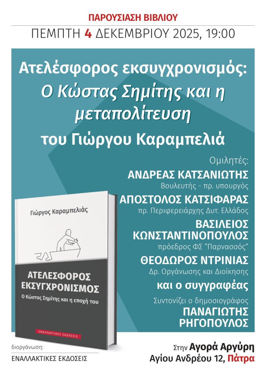 Την Πέμπτη 4 Δεκεμβρίου 2025 στις 19:00 οι Εναλλακτικές Εκδόσεις διοργανώνουν παρουσίαση του βιβλίου του Γιώργου Καραμπελιά: