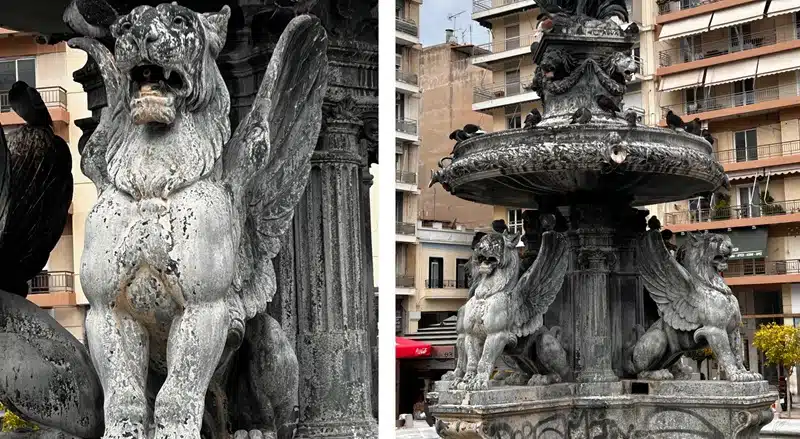 Όχι μόνο γύρω από τα τέσσερα μπρούτζινα λιονταράκια (γρύπες) που βγάζουν νερό αλλά και σε άλλα σημεία τους, όπως στις βάσεις του υδροχόου (στο κάτω σιντριβάνι) και του αυλοφόρου (στο πάνω σιντριβάνι) που κοσμούν τις κορυφές τους. Επιπλέον οι βανδαλισμοί, με τα συνθήματα που έχουν γραφτεί στο περιστύλιο τους κυκλικά έχουν κάνει ακόμα χειρότερη αισθητικά την κατάσταση τους.