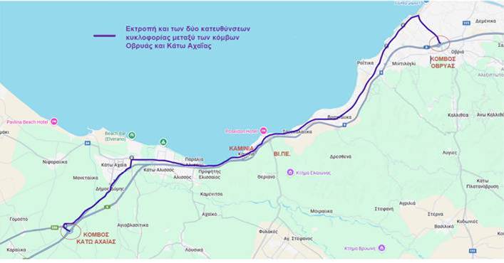 Στο πλαίσιο εργασιών ολοκλήρωσης του νέου αυτοκινητόδρομου Πατρών–Πύργου και όλων των συνοδών έργων που αφορούν στον αυτοκινητόδρομο, από την Πέμπτη 20.11.2025 έως την Κυριακή 30.11.2025, θα εφαρμοστεί εκτροπή και των δυο κατευθύνσεων κυκλοφορίας στην Π.Ε.Ο. Πατρών-Πύργου από τον Ανισόπεδο Κόμβο ΒΙ.ΠΕ. (Χιλιομετρική Θέση 7,0) έως τον Α/Κ Κάτω Αχαΐας (Χ.Θ. 17,9). Στο ενδιάμεσο τμήμα, οι κάθετες οδοί που συνδέουν την Π.Ε.Ο. Πατρών-Πύργου με τους οικισμούς νότια του αυτοκινητόδρομου θα παραμένουν σε λειτουργία. Με τη συγκεκριμένη κυκλοφοριακή ρύθμιση επεκτείνεται κατά 11,0 χιλιόμετρα η υφιστάμενη ρύθμιση μεταξύ Κόμβου Οβρυάς και ΒΙ.ΠΕ., όπως φαίνεται στο ακόλουθο σχεδιάγραμμα.