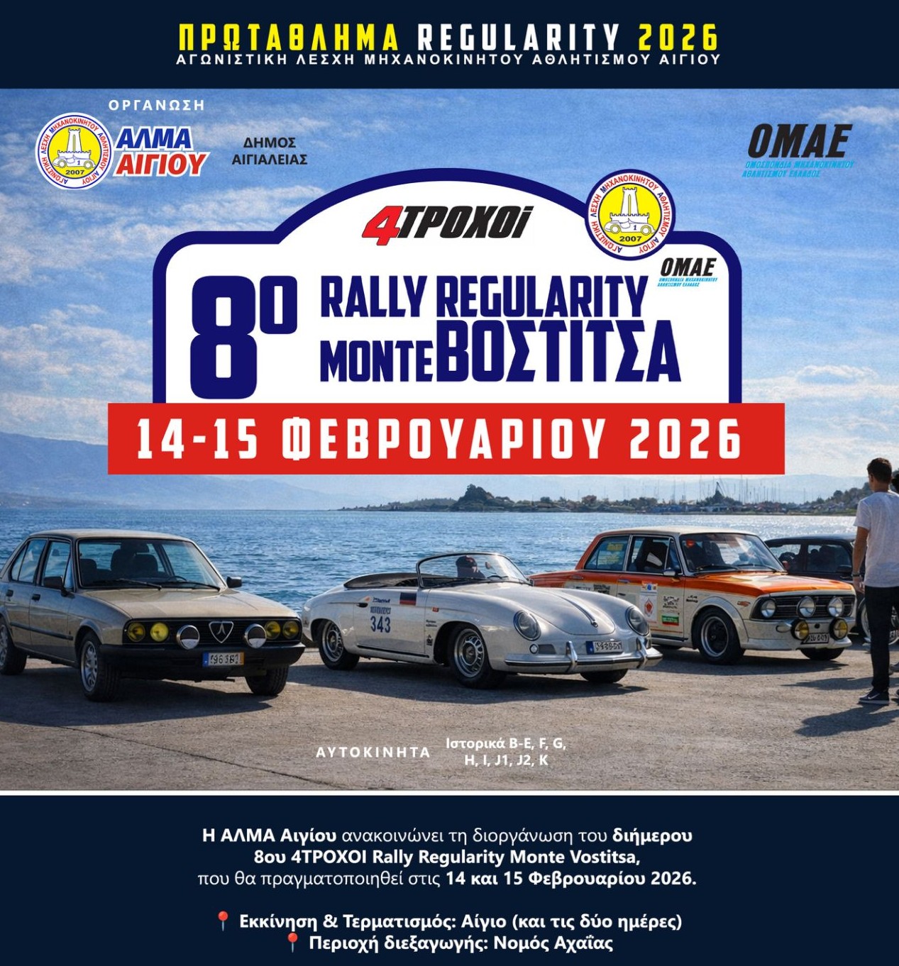 Με τον πιο δυναμικό τρόπο αναμένεται να ξεκινήσει η αγωνιστική σεζόν του 2026 για τους λάτρεις των ιστορικών οχημάτων και της ακρίβειας. Η Αγωνιστική Λέσχη Μηχανοκίνητου Αθλητισμού (ΑΛΜΑ) Αιγίου ανακοίνωσε ότι το δημοφιλές διήμερο «Monte Βοστίτσα» θα αποτελέσει τον εναρκτήριο αγώνα του Πρωταθλήματος Regularity 2026.