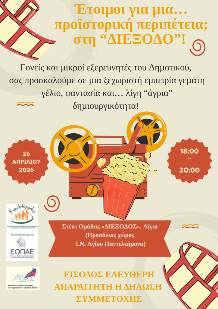 Η Εθελοντική Ομάδα Πρόληψης «ΔΙΕΞΟΔΟΣ» Αιγίου του Κέντρου Πρόληψης των Εξαρτήσεων και Προαγωγής της Ψυχοκοινωνικής Υγείας Π.Ε. Αχαΐας «Καλλίπολις» που λειτουργεί σε συνεργασία με τον Εθνικό Οργανίσμο Πρόληψης & Αντιμετώπισης Εξαρτήσεων (Ε.Ο.Π.Α.Ε.) και την υποστήριξη του Δήμου Αιγιαλείας , προσκαλεί την Κυριακή 26 Απριλίου 2026 και ώρα 18:00 – 20:00 οικογένειες (γονείς και παιδιά ηλικίας δημοτικού σχολείου) για να παρακολουθήσουν μαζί μια ιστορία πλούσια σε νοήματα , συναισθήματα και πρωτόγονη αγάπη.