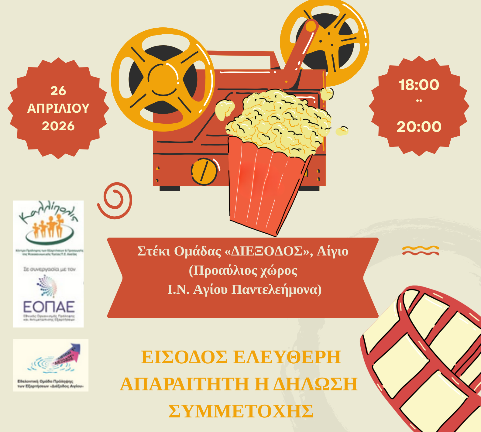 Η εκδήλωση θα πραγματοποιηθεί στο Στέκι της Εθελοντικής Ομάδας Αιγίου «ΔΙΕΞΟΔΟΣ» που βρίσκεται στον προαύλιο χώρο του Ι.Ν Αγίου Παντελεήμονα στο Αίγιο (είσοδος από Κλ.Οικονόμου). Η συμμετοχή είναι δωρεάν και είναι απαραίτητη η δήλωση ενδιαφέροντος στον εξής σύνδεσμο μέχρι την Πέμπτη 23 Απριλίου 2026: https://docs.google.com/forms/d/e/1FAIpQLSdIQJs1lG0FDS9e_LA0AE1Oaeg7SU0ZYwm6j7s8mf_GPWBmJg/viewform?usp=header