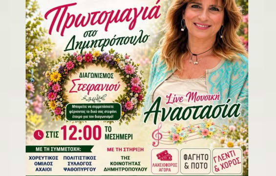 Με μια ξεχωριστή γιορτινή εκδήλωση υποδέχεται τον Μάιο ο Πολιτιστικός και Αθλητικός Σύλλογος Δημητρόπουλου «Η Πρόοδος», προσκαλώντας κατοίκους και επισκέπτες να γιορτάσουν την Πρωτομαγιά σε κλίμα χαράς, αισιοδοξίας και ανοιξιάτικης διάθεσης.