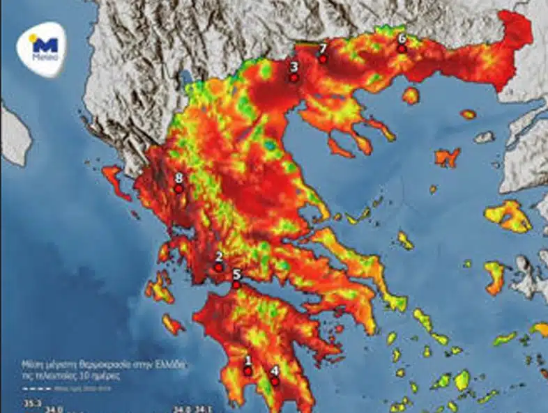 Στον χάρτη της εικόνας που ακολουθεί παρουσιάζεται η κατανομή της μέγιστης θερμοκρασίας σύμφωνα με το δίκτυο αυτόματων μετεωρολογικών σταθμών του meteo.gr / Εθνικού Αστεροσκοπείου Αθηνών ενώ σημειώνονται και οι 8 σταθμοί που κατέγραψαν τις υψηλότερες θερμοκρασίες.