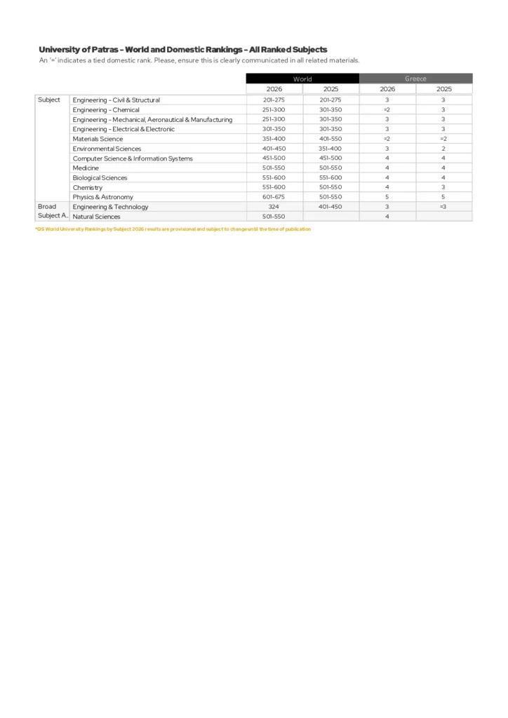 Σύμφωνα με τα επίσημα στοιχεία της κατάταξης, το Πανεπιστήμιο Πατρών σημείωσε εντυπωσιακή άνοδο στον τομέα Engineering & Technology, καταλαμβάνοντας τη θέση 324 παγκοσμίως μεταξύ 3.067 ιδρυμάτων, έναντι της θέσης 401–450 το 2025. Η συγκεκριμένη επίδοση αποτελεί ιστορικά υψηλό σημείο για το Ίδρυμα στον συγκεκριμένο επιστημονικό τομέα και καταδεικνύει τη συνεχή ενίσχυση της ερευνητικής και εκπαιδευτικής του δραστηριότητας. Παράλληλα, αξιοσημείωτη είναι και η παρουσία του Πανεπιστημίου στις Φυσικές Επιστήμες (Natural Sciences), όπου κατατάσσεται στις θέσεις 501–550 διεθνώς, διατηρώντας τη σταθερή του θέση στον παγκόσμιο ακαδημαϊκό χάρτη.