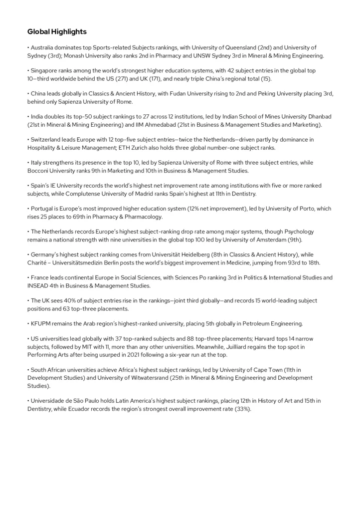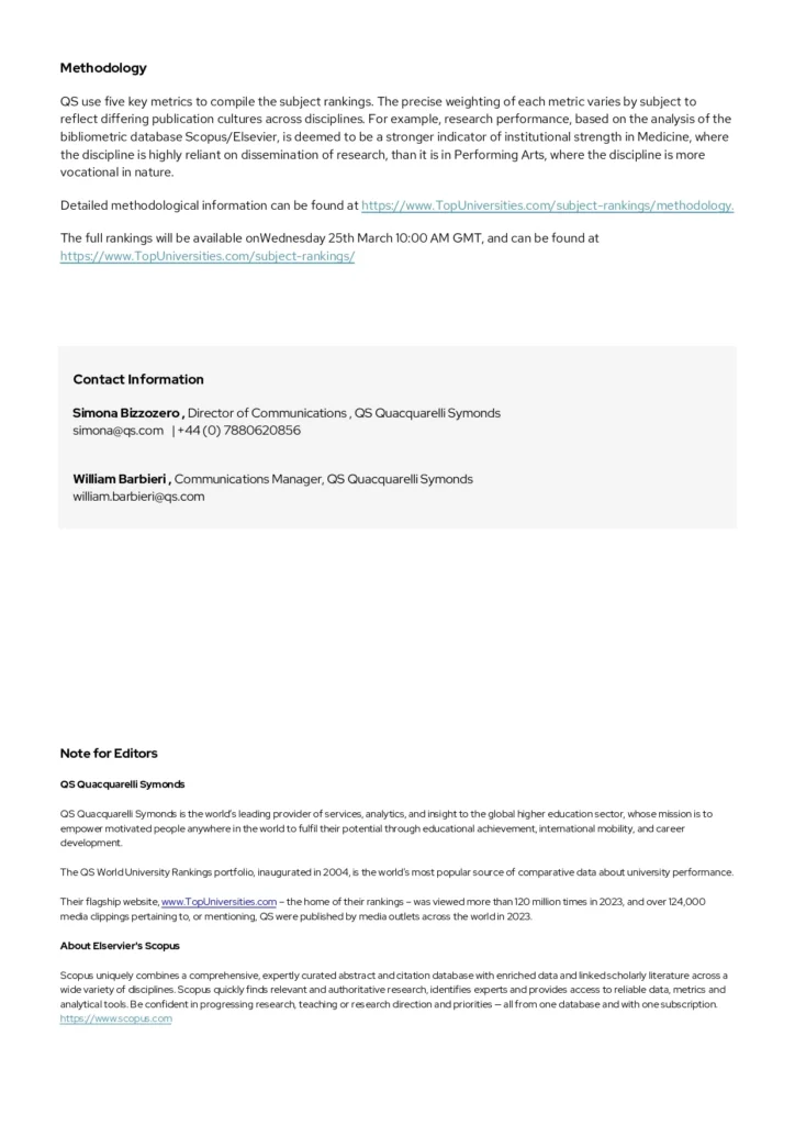 - Στα κορυφαία 400 ιδρύματα: Engineering – Electrical & Electronic (301–350) και Materials Science (351–400).
