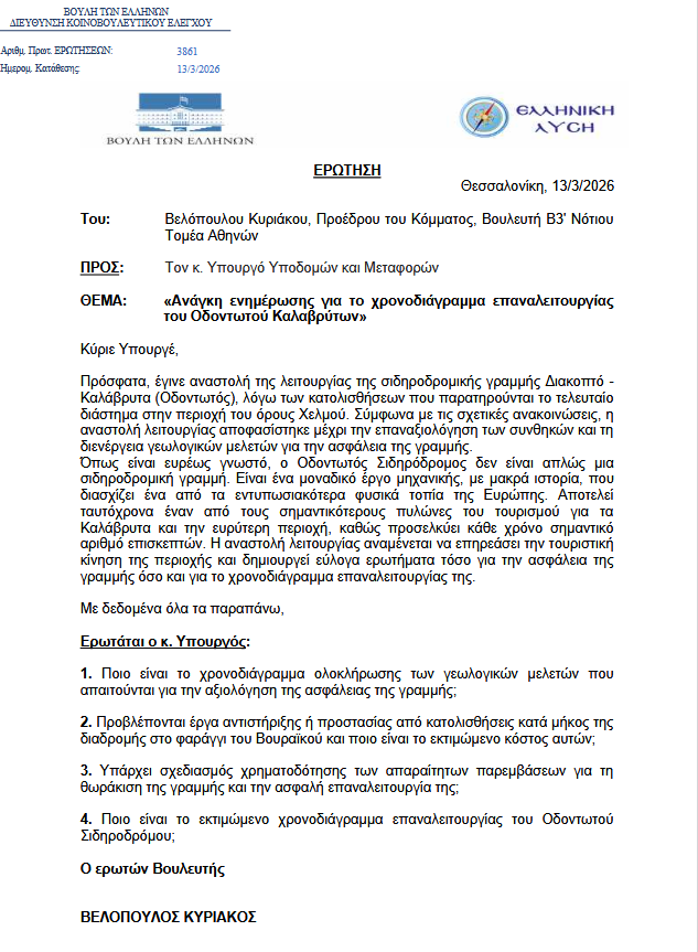 Με κοινοβουλευτική ερώτηση προς τον Υπουργό Υποδομών και Μεταφορών, ο Πρόεδρος της Ελληνικής Λύσης Κυριάκος Βελόπουλος ζητά σαφείς απαντήσεις για το χρονοδιάγραμμα των γεωλογικών μελετών, τα έργα προστασίας από κατολισθήσεις και την ασφαλή επαναλειτουργία της ιστορικής γραμμής.