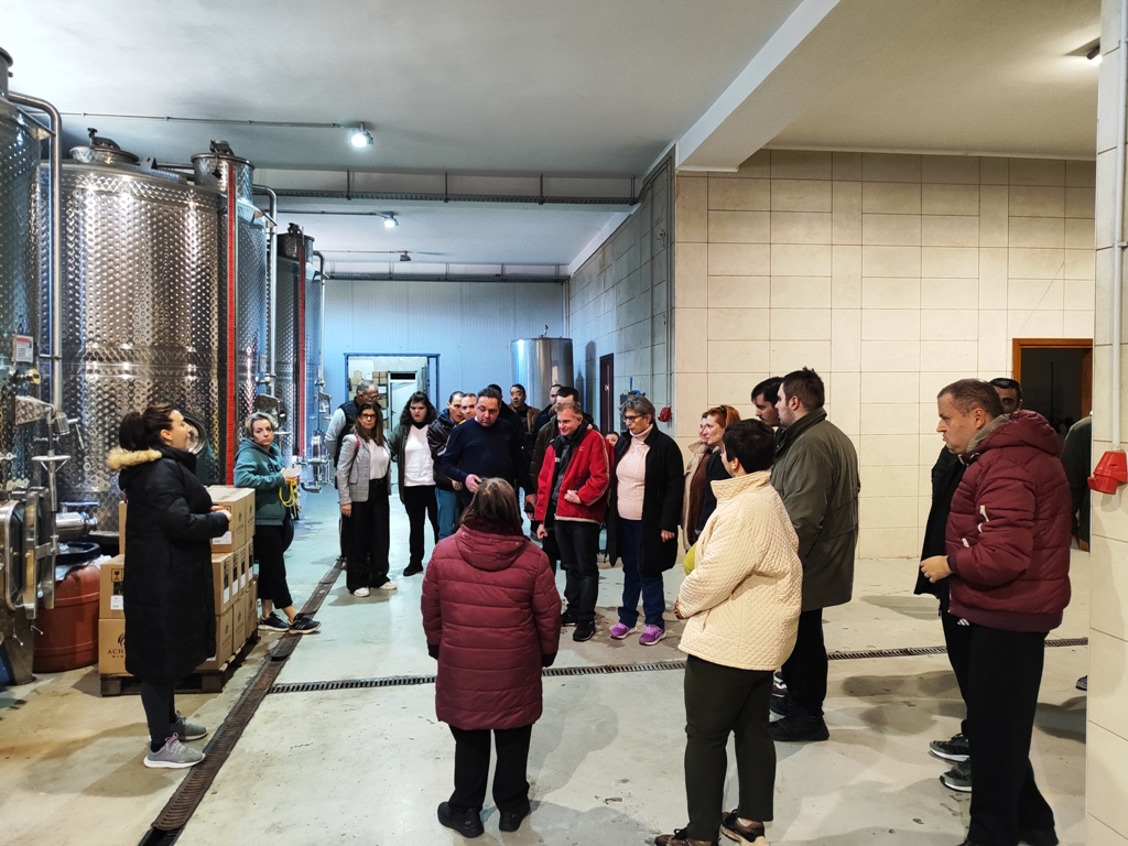 Στην είσοδο του οινοποιείου τους υποδέχτηκαν στην οικογενειακή επιχείρηση οι κυρίες Σωσάννα και Κατερίνα Κατσικώστα. Αρχικά είδαν τις δεξαμενές στο ισόγειο του οινοποιείου και στη συνέχεια κατέβηκαν στο υπόγειο για να δουν το κελάρι και τα κρασιά που αποθηκεύονται σε ξύλινα βαρέλια. Η ξενάγηση στο χώρο του οινοποιείου έγινε από την κυρία Σωσάννα Κατσικώστα και ομολογουμένως κατάφερε να μυήσει τους ωφελούμενους με τον καλύτερο τρόπο στην κατανόηση της παραγωγής κρασιού καθώς ήταν μεταδοτικότατη και κατανοητή.