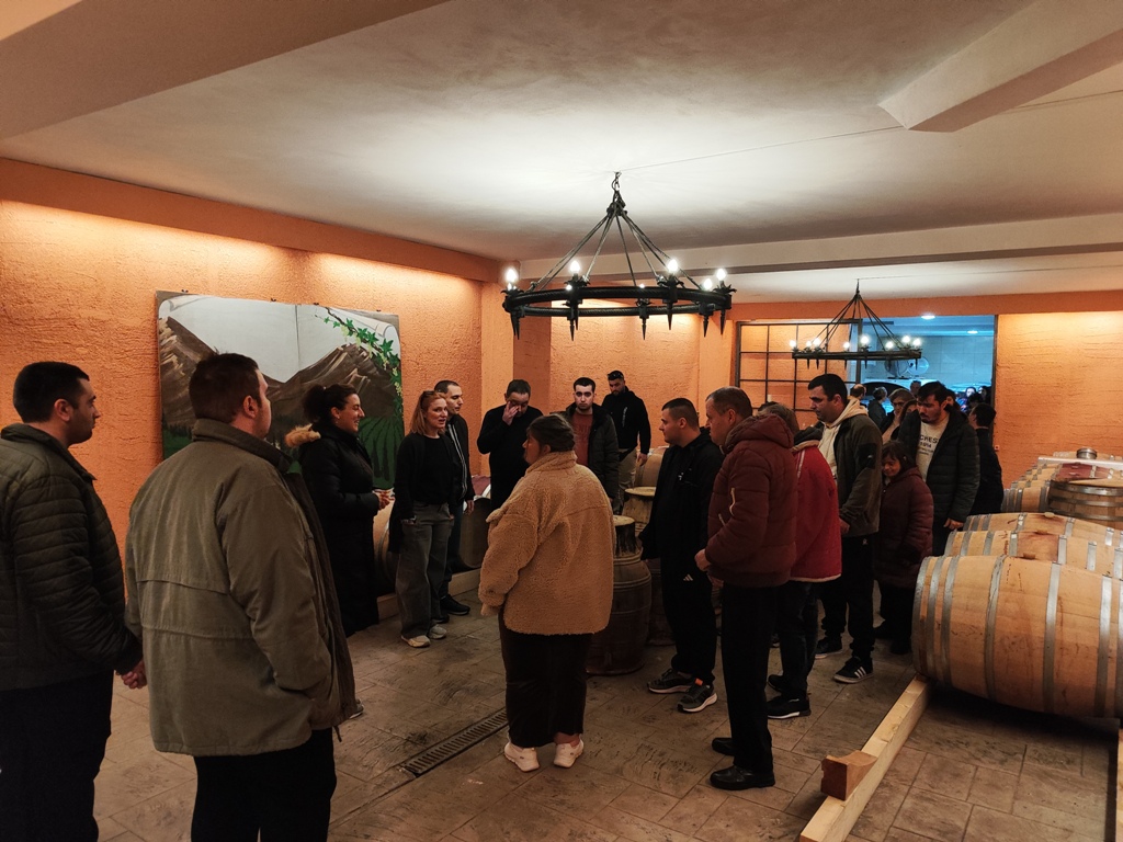 Στην είσοδο του οινοποιείου τους υποδέχτηκαν στην οικογενειακή επιχείρηση οι κυρίες Σωσάννα και Κατερίνα Κατσικώστα. Αρχικά είδαν τις δεξαμενές στο ισόγειο του οινοποιείου και στη συνέχεια κατέβηκαν στο υπόγειο για να δουν το κελάρι και τα κρασιά που αποθηκεύονται σε ξύλινα βαρέλια. Η ξενάγηση στο χώρο του οινοποιείου έγινε από την κυρία Σωσάννα Κατσικώστα και ομολογουμένως κατάφερε να μυήσει τους ωφελούμενους με τον καλύτερο τρόπο στην κατανόηση της παραγωγής κρασιού καθώς ήταν μεταδοτικότατη και κατανοητή.