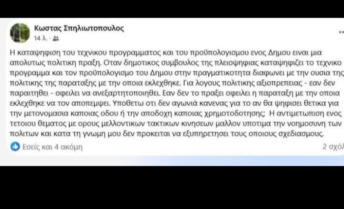Συνέχεια όμως δόθηκε και από τον πρώην ΓΓ του αείμνηστου Δημάρχου Καλογερόπουλου, κ. Κ. Σπηλιωτόπουλο ο οποίος εν ολίγοις πέταξε σπόντες κατά Β. Χριστόπουλου και Μ. Σταυροπούλου λέγοντας ευθέως ότι “όταν σύμβουλος της πλειοψηφίας καταψηφίζει τεχνικό πρόγραμμα και προϋπολογισμό…. διαφωνεί με την πολιτική της παράταξης…” και άρα “πρέπει να παραιτηθεί ή να ανεξαρτητοποιηθεί ή να αποπεμφθεί…”.