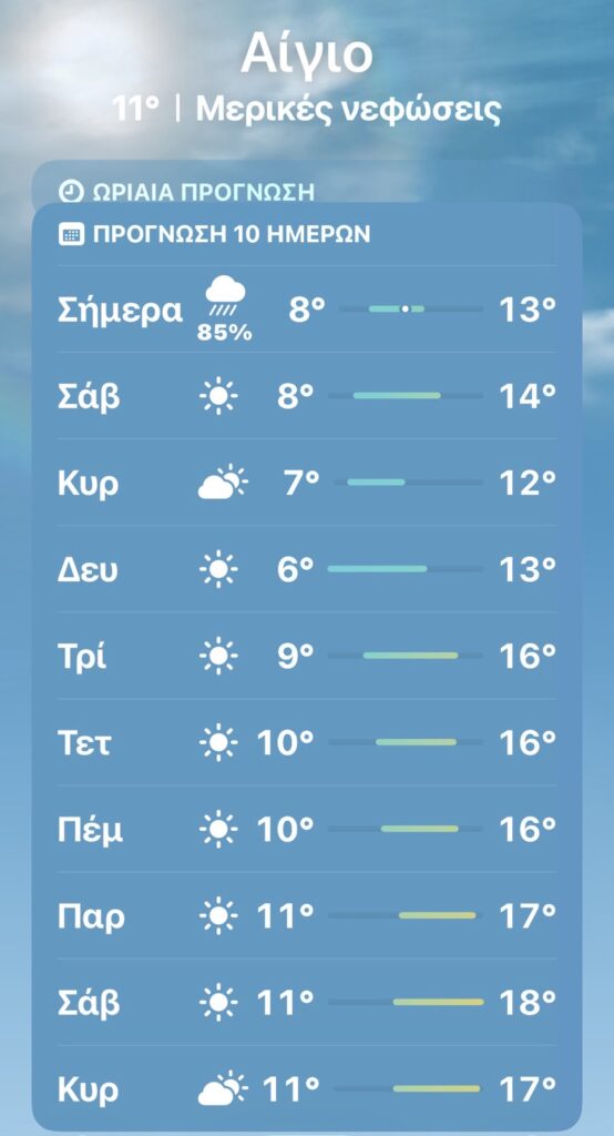 Στο Αίγιο, “πορτοκαλί” προειδοποίηση σήμερα για καταιγίδα μέχρι το μεσημέρι. Ριπές ανέμου στα 16 χλμ/ωρα και θερμοκρασία από 8 έως 13 βαθμούς.
