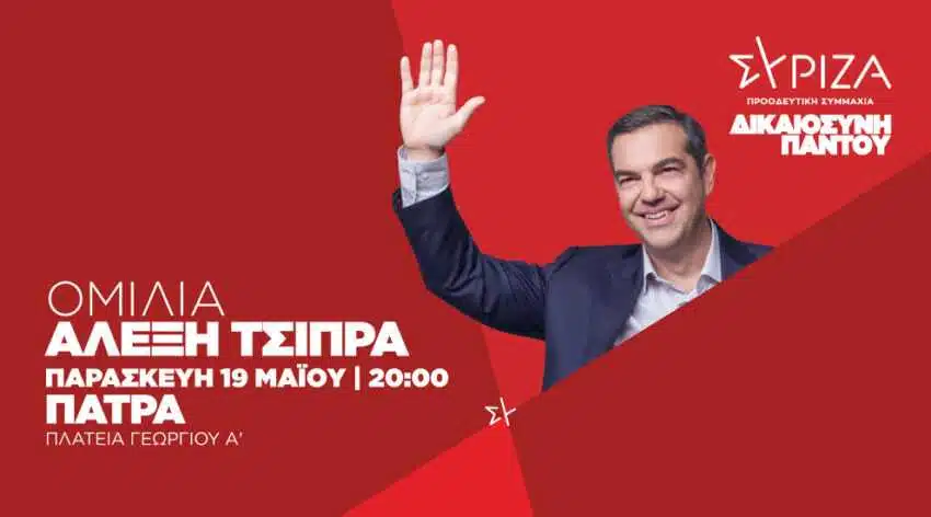 “Είμαστε στην τελική ευθεία για την ομιλία του Προέδρου του ΣΥΡΙΖΑ Προοδευτική Συμμαχία Αλέξη Τσίπρα στην Πάτρα την Παρασκευή 19.5 στην πλατεία Γεωργίου στις 8:00 μμ.”, επισημαίνεται από την Ν.Ε. του ΣΥΡΙΖΑ Αχαϊας.