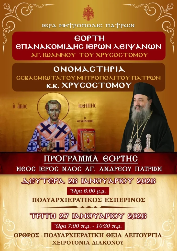 Ὁ ἑορτασμός τοῦ μεγάλου πατρός καί διδασκάλου τῆς Ἁγίας μας Ἐκκλησίας, Ἁγίου Ἰωάννου τοῦ Χρυσοστόμου, θά πραγματοποιηθῇ στόν Νέο Ἱερό Ναό Ἁγίου Ἀνδρέου Πατρῶν, κατά τό ἑξῆς Πρόγραμμαq